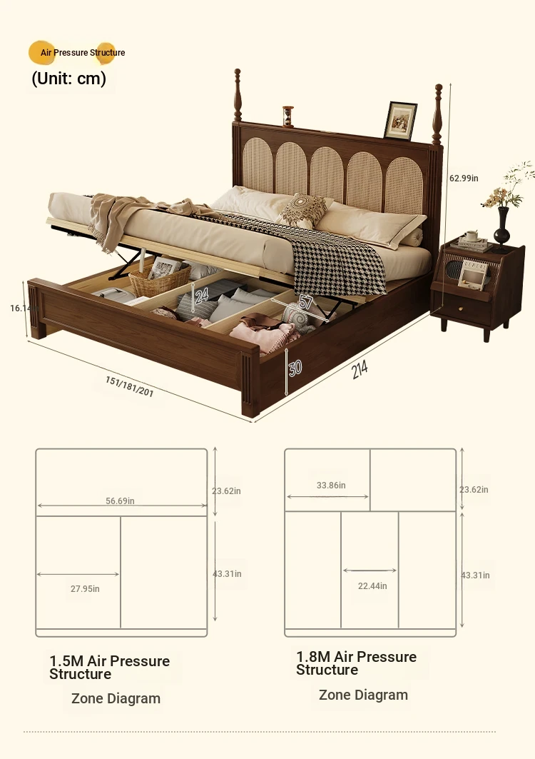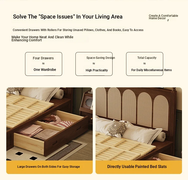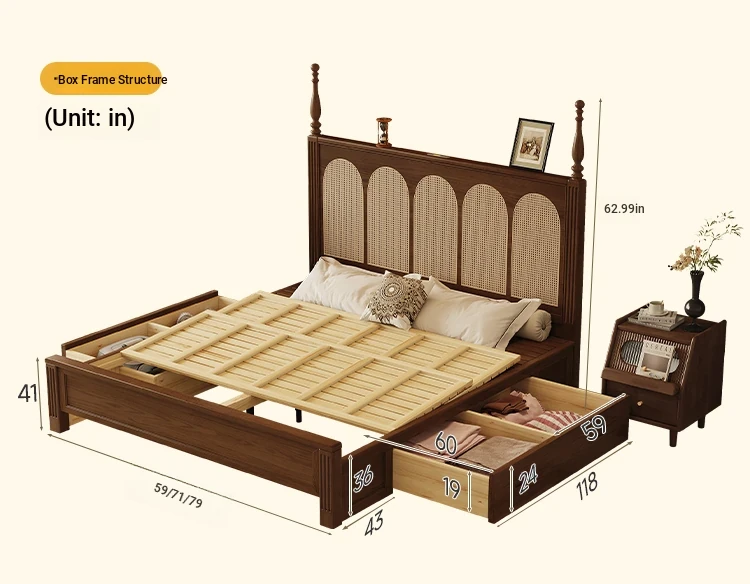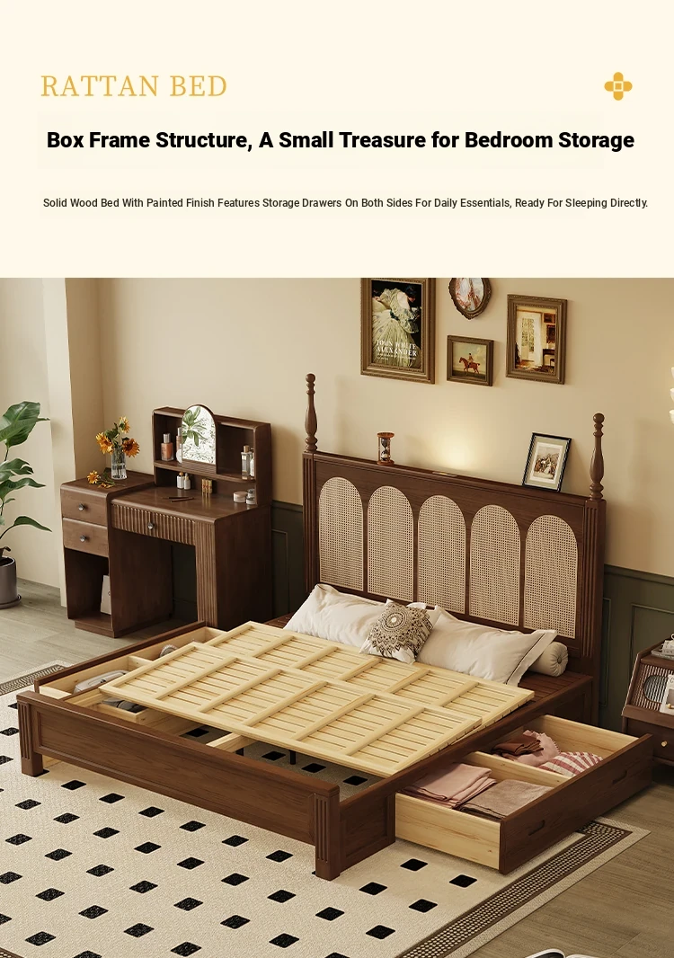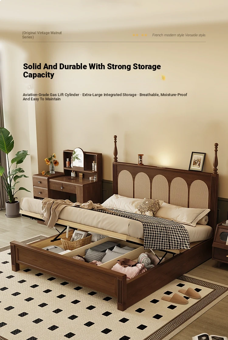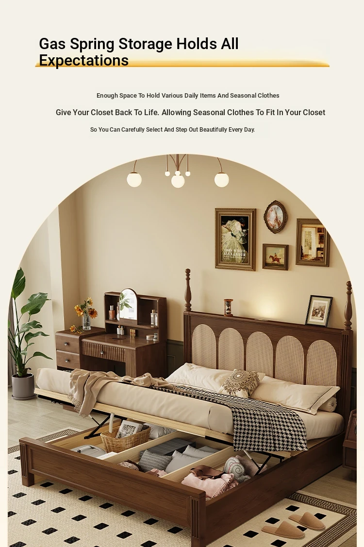 **Elegant Solid Wood Double Bed - American & French Vintage Style Ash Wood High Storage Bed with Under-bed Storage Space**